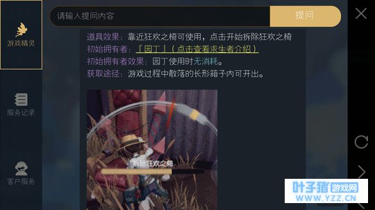 总的来说是初期最好用的角色,3个buff1个debuff,debuff分摊在全队身上,初期没买其他角色的情况下,慈善家绝对是最好的选择,不说手电筒这个用处,慈善家也是前期 强推 的角色。(新手手电筒可能用不好,请谨慎使用) 5. 园丁,园丁初期进行两把游戏后即可解锁,园丁开局自带工具箱且工具箱可无限制使用,主要用于四园丁拆迁队。