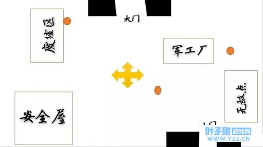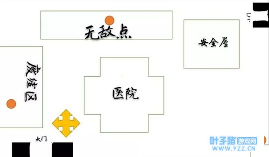 医院的三个橙色圆圈表示地窖随机发生的大致位置,三个任选一个产生地窖。 医院一楼或者二楼必有一到两台密码机,而且很安全喔~一般屠夫都不会去的,因为很浪费时间。 无敌点和安全区是你溜屠夫的地方,可以在这里大展身手,被屠夫追挺刺激的。 废墟区是比较难逃的地方,在这里遇到屠夫可能会凉哦~ 02 军工厂地图