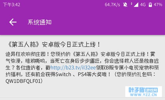 预约码就在通知里面哦 系统通知 《第五人格》安卓版今日正式上线! 诡异狂欢响彻庄园! 您预约的《第五人格》安卓版今日正式上线! 雾气弥漫, 暗鸦嘶鸣,当死亡在身后步步逼近,你会选择救人还是独自逃生? 各位造访者,戳http://b23.tv/il32ee领取B服专属小电视宠物和预约福利,还有机会获得Switch、PS4等大奖哦! (您的预约礼包码:QW1DBFQLF01 3.游戏中领取奖励
