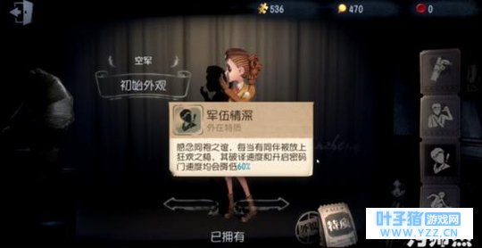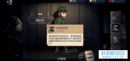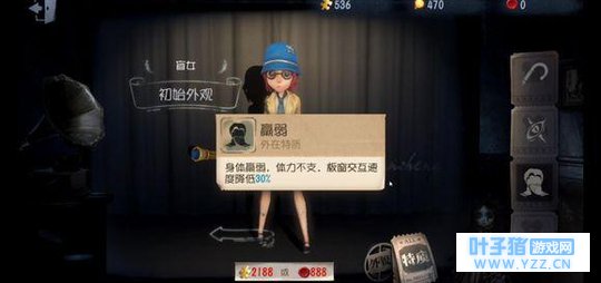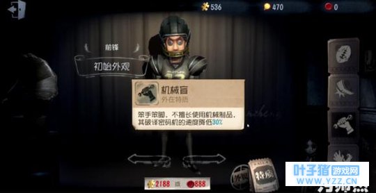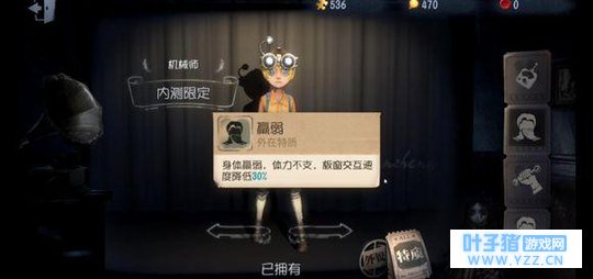 交互速度大幅度降低,降低逃脱率 当有队友受伤时或者被放在火箭座椅时修电机的速度会大大降 玩法: 团队型人物,不建议个人使用 和朋友开黑的不错选择,交互过慢需要提前与监管者拉开距离