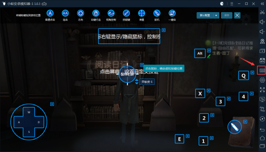 都设置完点击"保存并关闭"会提示重启模拟器,记得要重启哟。 接下来我们进入游戏进行按键设置。按键设置选项在模拟器右边的小键盘的图标既是。 如果大家是按照我的步骤下载的游戏及设置,进入游戏后,会有一个默认的按键设置。默认的按键设置基本已经支持【第五人格】按键位置。当然,我们也可以根据自己的需求添加或者更改一些按键。