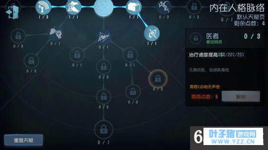 【旁观者】: 治疗速度提升,显示受伤的求生者。 友善(下边方向): 主要的救人治愈加点方向,核心天赋是【医者】,【羊群效应】,【化险为夷】。这边适合喜欢求人的小伙伴加点,如果团队中配一个医生的话,治疗速度将会很可观,也适合配合一些空军救人等阵容套路中加点。