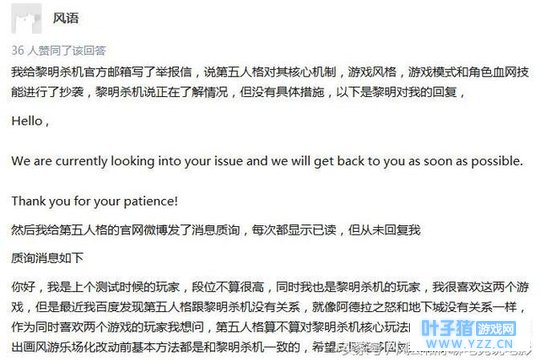 有不少黎明杀机的玩家看见这款游戏后在黎明杀机贴吧提问:这款游戏有版权吗? 吧友们的回复都是没有。而有网友就此向黎明杀机的厂商发送了一份举报信,并在在第五人格的官博私信进行了咨询。 黎明杀机厂商随后邮件回复道:我们正在调查您提交的问题,我们会尽快回复您,感谢!