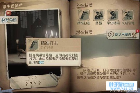 作为容错率最高的一名角色,空军玛尔塔也是唯一一个可以与监管者反抗的角色。她一共有4个技能! 第一个技能,精准打击:随身携带信号枪,且拥有高级射击技巧,击中监管者后,监管者的眩晕时间增加30%。这个技能可以说是玛尔塔的核心技能了,不仅可以自救,同样也能够帮助即将被监管者抓到的或者已经被监管者扛在肩上的同伴。唯一的缺点可能是需要精准的枪法,不过这对于很多都玩过吃鸡的小伙伴们来讲, 并不是一件很难的事情。