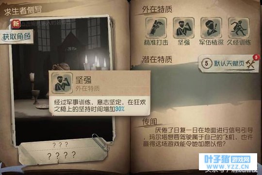 第二个技能的话,坚强:能够在狂欢之椅上的坚持时间比一般多30%。之前小编说过这是个容错率很高的角色,这个技能对于被拯救来讲也是一个非常不错的技能。不过关键还是要有人愿意救你。