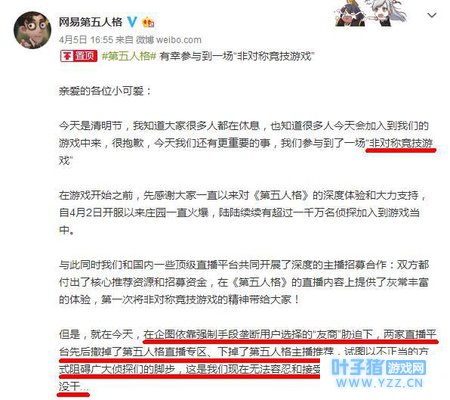 同样是一款深受广大玩家喜爱的手游,能够在目前“吃鸡”热潮中异军突起,说明《第五人格》其游戏本身有独特的魅力,这样的一款游戏受到了直播平台的打压实属让广大玩家不能忍受,对此,网易官博发文谴责此事,表示这是一场“非对称竞技”,声称“友商”通过不正当方式胁迫直播平台打压《第五人格》,企图垄断用户选择。