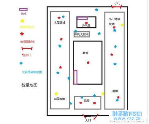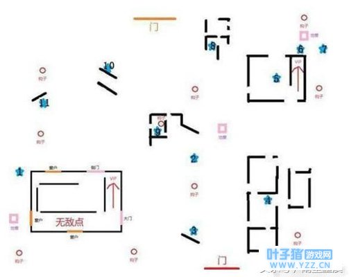 其实这游戏的地图都是大同小异,中间一栋楼,向南必有门,这里说的南是正南方向,我们来看一下图: