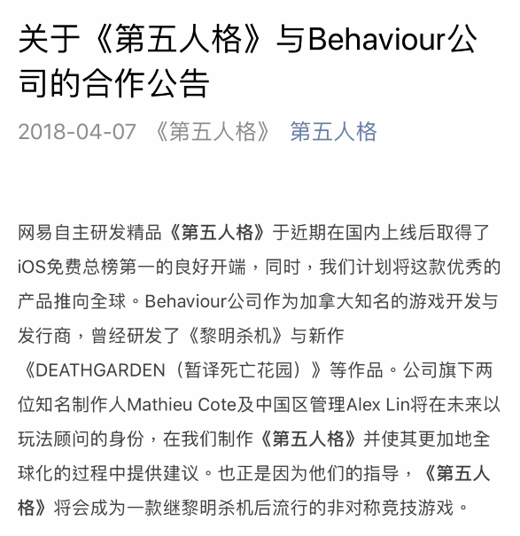 又一单中外合作!网易宣布旗下手游《第五人格》与《黎明杀机》开发商Behavior展开合作