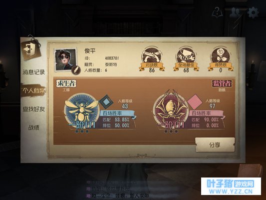 监管者-鹿头 上手难度:★★★★★ 精通难度:★★★★★ 抓人难度:★★★ 作者喜好:❤❤❤❤❤ 适合人群:中端、高端玩家 技能1简述:对着正前方直线扔个链子,勾到人把人拉过来,勾到墙壁自己过去。 技能2简述:不仅能勾人,还能带伤害 个人认为现版本考研技术又好玩又可怕的监管者就是鹿头了。能远距离勾人不仅让逃脱者感到压力,最重要的是鹿头可以说是最难遛的监管者了。如果逃脱者想诱惑鹿头靠近木板企图砸晕鹿头,这是不可能的,鹿头直接把你从木板处勾出来。在满存在感之后的鹿头更可怕,钩子带伤害,够过来补一刀平砍,相当于直接秒了,运气好的时候钩子命中同时暴击直接秒人。这种指向性投掷的技能肯定要练准头的,玩鹿头真的好过瘾。 结语 现版本只开放了四个角色,相信未来有更多监管者角色给玩家体验。不知道大家喜欢用哪个?擅长用哪个?相信经过小俊子的点评,大家心里有点数了吧?无论用哪个,都必须要练好平砍时机,否则连第一个逃脱者都抓不住,那就别提技能了。下图为作者本人战绩图,求逃脱者老司机一起遛监管者~