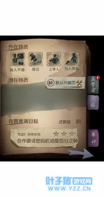 改图律师,图标自己瞎jer改的 外在特质: 【诲人不倦】:在教授的教育与鼓舞下,所有人相信自己将会顺利逃脱。 所有人破译电机速度增加百分之5,狂欢之椅坚持时间增加百分之 10 【修正】:被追击时使用板擦擦去15s内的红色足迹以及翻板等交互特效