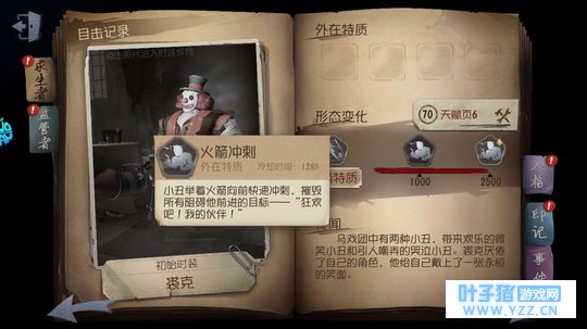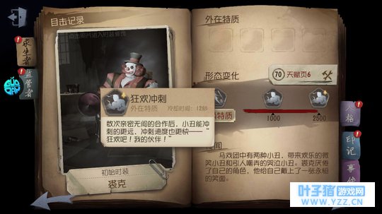 小丑行走速度中规中矩,没有鹿头那么迟钝,但也没杰克进化后那么快。没点存在感天赋的玩家较容易锤出2下触发技能。技能向前冲刺一段距离,基本连招,锤,僵直,再冲刺。最大化保障追人效率,因为锤完后的僵直很长,小丑技能完美追击,即便是技能没有打到,后续的追击也不会因为僵直找不到人。进化后的技能更是能追一条街,下面是推荐天赋。