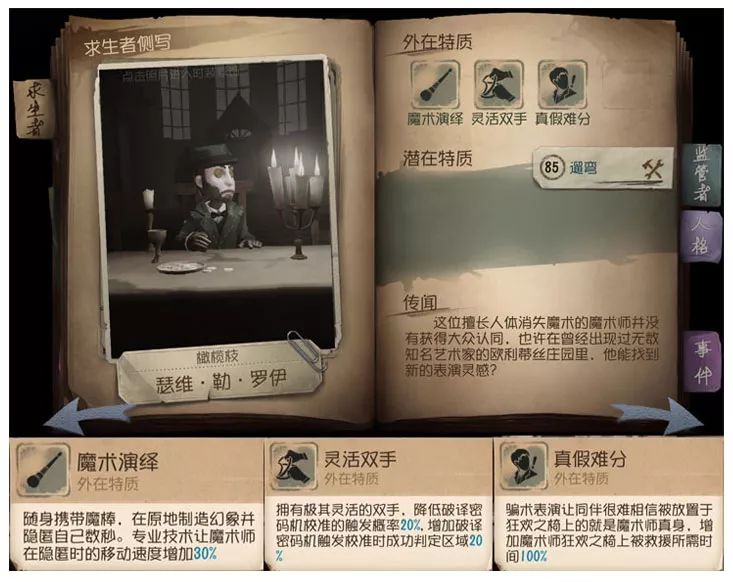 使用技巧 魔术师算是我用得比较多的角色。幻影骗骗萌新屠夫很好用,但对付有经验的屠夫大佬就不太吃这一套了,所以还是加速逃跑更加实在。有人说魔术师适合溜屠夫,这里不是很赞成,毕竟魔杖是次数只有2次,还是紧急关头用吧,不要忘记你还有解码的天赋!总的来说算是比较全面的角色,手头有碎片的话还是建议尽早开一下。