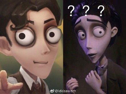 左为第五人格,右为僵尸新娘 《僵尸新娘》于2005年9月23日上映的人偶动画电影,由蒂姆·伯顿、麦克·约翰森导演,约翰尼·德普,海伦娜·伯翰·卡特,爱美丽·华生主演的动画电影。讲述了19世纪欧洲的一个村庄,一个叫做维克多的男青年,正和朋友一起结伴返回自己的家乡,因为在那里有个美丽的新娘正在那里等待着与他完婚,他甚至可以想象到自己婚礼的奢华,一路上喜悦之情无法掩饰,当两人行走在阴森的树林中,树林中阴冷的寒风依然没能阻止维克多高涨的情绪。 该影片于2006年获得第78届奥斯卡最佳动画长片提名奖。