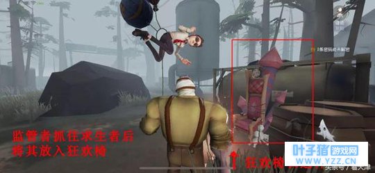 狂欢椅: 地图中共有12把狂欢椅(不包括地下室),这是监管者送求生者上天的工具。当求生者被绑上狂欢椅后会出现一个进度,进度满后该玩家就会被放飞(即淘汰)。求生者之间可以互相救助,被救下来再被绑到椅子上会加速放飞的速度。
