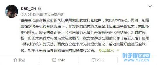 今天(4月10日)《黎明杀机》中国区官方微博与《第五人格》官博同时发声,对相关言论进行了正面的公告回复。微博内容请看下图: