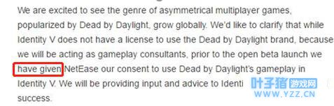 在图中标红位置这里, “have given”一词连接上下文其真实含义是强调 两家公司的合作已有时日,即“在公开测试版发布之前,我们已同意让网易使用黎明杀机的游戏玩法”, 而非中文版公告中所说的“允许在公测前使用,公测后就不能使用”之意!所以,看公告还是要看英文原文!避免类似的翻译歧义! 所以两分公告的真正含义是:《第五人格》无《黎明杀机》的品牌授权,但在玩法方面是得到Behavior公司的许可的!两家公司将继续合作,推动《第五人格》的不断发展!所以根本不存在所谓的“抄袭”现象。