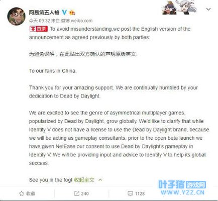 《黎明杀机》中国官博发出的中文版公告,以下为原文: 首先衷心感谢粉丝们长久以来对我们的支持和维护,我们非常感动。同时,能看到在黎明杀机的有效促进下,非对称竞技类游戏在全球范围越来越壮大,我们感到很欣慰。需要明确的是,《网易第五人格》并没有获得《黎明杀机》品牌授权,但因未来我方将成为其玩法顾问,我方在游戏公测前允许《第五人格》使用《黎明杀机》的玩法。而我方会在未来为其提供建议,帮助其更好的进行全球化。如果未来有任何新的进展我们会另行公告。