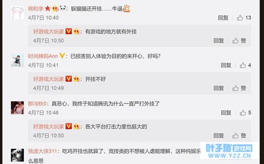 玩家吐槽 从网友的吐槽可以看出,开挂的只是一小部分人,绝大部分网友还是喜欢公平竞技,凭自己的本事说话的;“躲猫猫还开挂?”哪能怎么办有的人玩俄罗斯方块都开挂;“以损害别人体验为目的的开心,好吗?”,有的人就是喜欢干损人不利己的事,喝“七个核桃”喝的吧;“有游戏的地方就有挂”,有人的地方就有江湖,还是祝愿他们早点“湿鞋”吧。