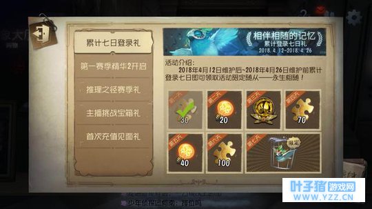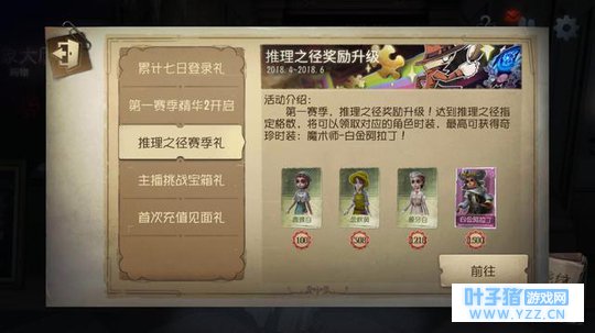 登陆奖励 然后就是每天的搬砖福利了相当于,通过积累推理之径的步数,达到指定步数之后能够获得特定的奖励,其中包括三款医生的时装,和一款魔术师的时装。医生的三套基本上是同一套换了不同的颜色而已,不过魔术师的这套白金阿拉丁还是非常不错的。