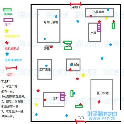 军工厂的无敌点军工厂主要要利用正门废墟处两个窗户的地方溜屠夫,在这里来回翻窗溜监管者很无敌。还有四合院和木屋也可以溜屠夫,月亮门那里也不错。