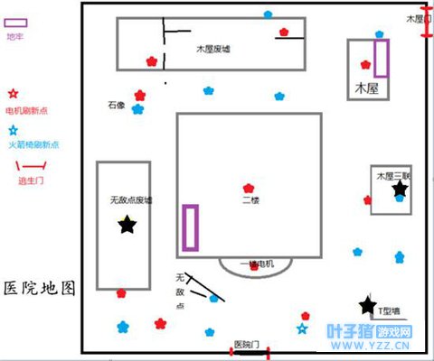 医院的地窖分别在无地点废墟中间、右边木屋里和右下角的T型墙附近。 教堂 教堂中的地窖在花园废墟里、花园附近靠近墓碑、还有是右上角靠近门。 每张地图都有3个地窖,求生者无论选择哪一个都是可以顺利逃跑的。 |