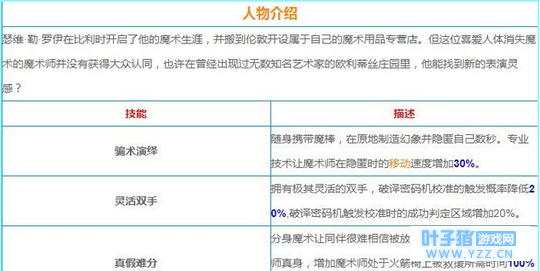 人物介绍 技能描述 骗术演绎随身携带魔棒,在原地制造幻象并隐匿自己数秒。专业技术让魔术师在隐匿时的移动速度增加30%。 灵活双手拥有极其灵活的双手,破译密码机校准的触发概率降低20%,破译密码机触发校准时的成功判定区域增加20%。 真假难分分身魔术让同伴很难相信被放置于火箭椅上的就是魔术师真身,增加魔术师处于火箭椅上被救援所需时间100%。