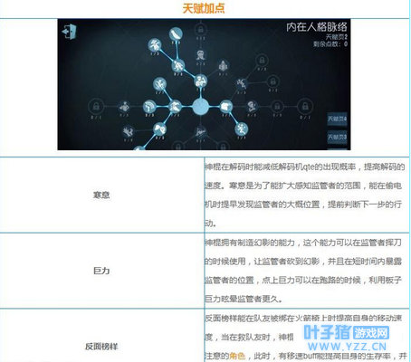 天赋介绍 天赋加点 寒意神棍在解码时能减低解码机qte的出现概率,提高解码的速度。寒意是为了能扩大感知监管者的范围,能在偷电机时提早发现监管者的大概位置,提前判断下一步的行动。 巨力神棍拥有制造幻影的能力,这个能力可以在监管者挥刀的时候使用,让监管者砍到幻影,并且在短时间内暴露监管者的位置,点上巨力可以在跑路的时候,利用板子巨力眩晕监管者更久。