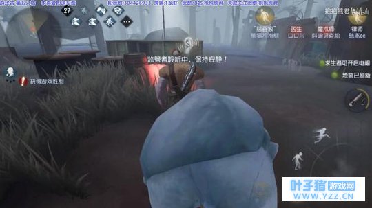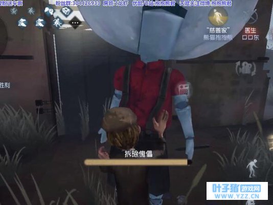 准备去开大门却被娃娃吓到的抱抱熊君 这个大娃娃相信大家都见过,这就是屠夫厂长的技能放一个带视野监控和传送功能的娃娃。这次抱抱熊忍不住了,为了开大门逃命必须先把娃娃给拆了,于是就慢慢在这拆娃娃。这期间厂长是没法使用娃娃的传送功能的。