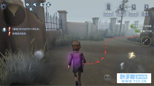 你不可能向监管者的方向走过去照他,那样等于自投罗网,你可以像图中的镜头,然后将手机左下方的方向操控杆往下滑按,然后就是一个倒退式的位移了,这种操作一定要提前了解到你身后的地形,这样,在对面追赶过来的过程中,就会被手电筒照射到了。