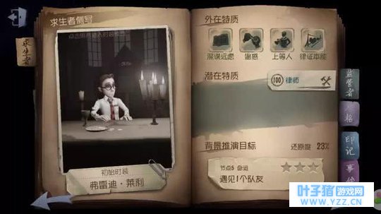 外在特质 深谋远虑: 随身携带地图,使用地图能显示一定范围内随机一台密码机的位置。使用地图不会产生消耗。 出场自带地图,适合不太熟悉地图的玩家。(身边有密码机时地图会亮,没有时则无法使用地图) 如果大家还比较熟悉地图,可以出场后迅速开箱,更换自己的道具,让自己的生存能力更强一些。 蛊惑: 所有人在狂欢之椅上坚持时间增加5%,同时他附近的求生者会受到激励,提升10%破译、治疗、和破坏行动的速度。 优秀的团队增福技能,也是他的核心技能之一。 主要的点在于,律师要和队友同时行动,结合天赋所产生增幅,使得整个团队可以更快的破解密码机。 1)如果你和朋友语音开黑,建议与律师一起,3人或2人结伴破解密码机。 2)独自一人玩,也尽量和队友汇合,一起破解密码机。 上等人: 板窗交互速度均降低15%。 那翻的叫一个慢啊!!! 身手不灵活就一定要注意安全。 律证本能: 能看到28米内的队友。 这个特质主要是和蛊惑配合,寻找队友,并联动的进行破解密码机。 综合以上4个特质: 出场带地图,在一定范围可以看到队友,和队友一起还能增加队友的破译速度。 这些特质决定了律师是一位偏辅助的职业,可以给队友增幅,所以一定要和队友在一起,你的特质与天赋才能效益最大化。