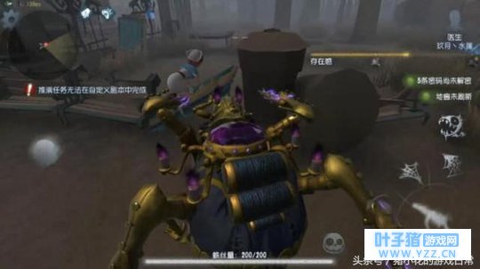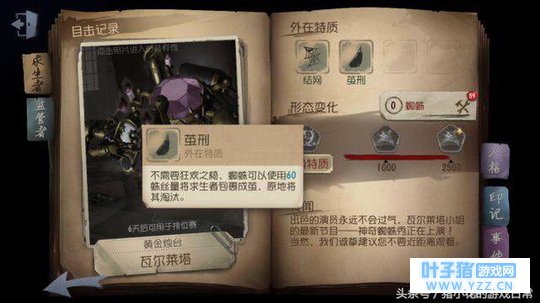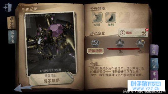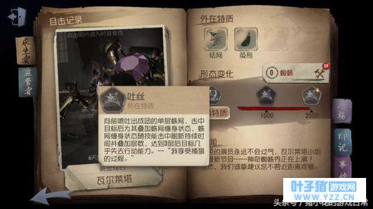 二、角色介绍 下面详细介绍一下蜘蛛这个人物。蜘蛛与目前已知的所以监管者都不同,我们都知道,外在特质是只有求生者才有的特质,而蜘蛛也是目前唯一一个拥有外在特质的监管者! 职业:马戏团演员 武器:机械臂 三、技能介绍