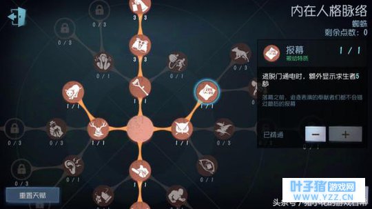 对于蜘蛛这个监管者,说实话带其它技能都不是特别有效果,唯有【巡视者】是比较有效果的。毕竟蜘蛛的攻击距离很短且蓄力时间短,必须要几乎贴脸才能击中,而蜘蛛体型较大,面对那些很会走位的人皇,身体不灵活这点就会很吃亏。 所以【巡视者】是比较适合蜘蛛的。 第二种“蜘蛛”天赋加点总览: 核心天赋:挽留、监禁空间、报幕