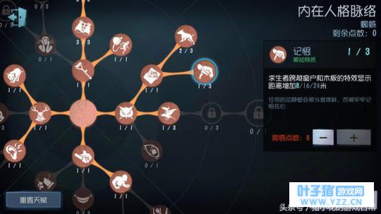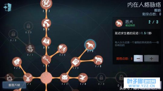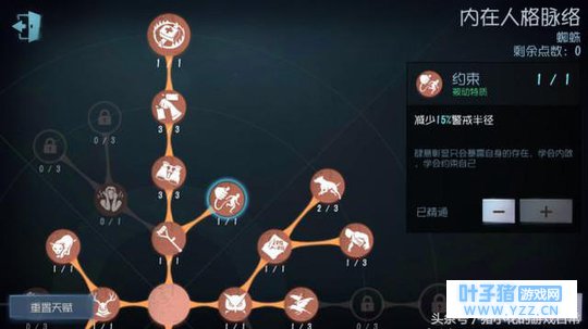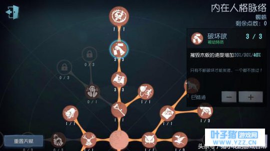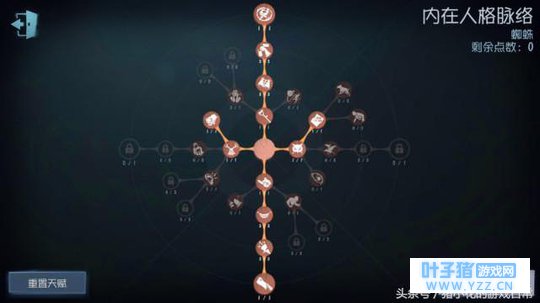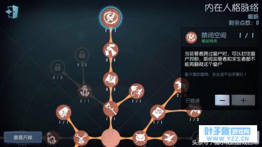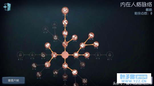 七、天赋与技能搭配 第一种“蜘蛛”天赋加点总览 核心天赋:禁闭空间、破坏欲、恶犬与记恨和约束。 (这里所说的核心天赋是相较于其它监守者)