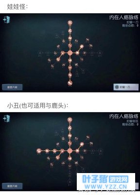 天赋加点我们都知道之前火热的王者荣耀和LOL都是有着天赋树的。而第五人格当然也不例外。作为一名屠皇,首先当然要把准备工作做好。 不同的英雄有不同的天赋树,各位可要收藏好了。 上面两个是娃娃怪和小丑的天赋,下面两个是鹿头和杰克的,小编暂时为大家介绍这四个英雄。 娃娃怪娃娃怪的天赋里有一个是可以增加跨越木板的速度的,这样一来,人类想用障碍物阻拦你必然是“竹篮打水一场空”咯。另外,根据大家各自的运气情况,(看大家是“欧皇”或是“非酋”的时间到了。)可以点出“一刀斩”的那个天赋,运气好的话可以18米外一刀砍晕人类哦。 小丑小丑的主要天赋是封窗和张狂,这个游戏里有详细介绍,小编就不在此赘述了。