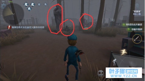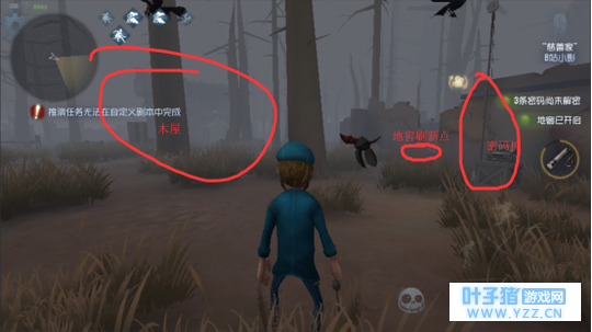 之后木屋旁边就是2个逃生门中的一个,要找逃生门可以通过找寻到地图中的木屋就能找到逃生门了