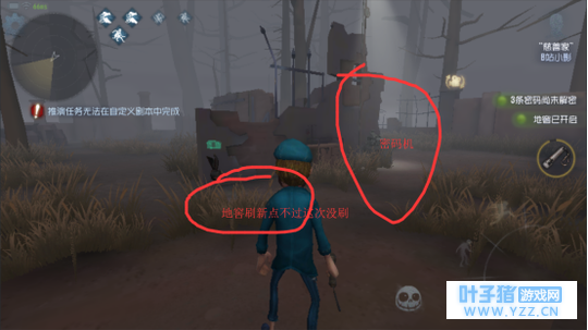 而木屋外的另一侧是一个废墟,我们将它统称为木屋废墟,木屋废墟中有2个密码机刷新点的。