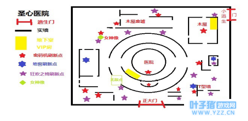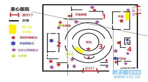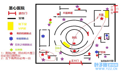 医院这个地图有个最明显的建筑也就是地图正中心的医院大楼。也就是地图3号区域中的医院大楼。 1号位中有个建筑也就是每个地图中一定出现的木屋这个木屋在地图的角落上 而木屋里面有个密码机刷新点和地下室刷新处,门外有个狂欢椅
