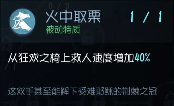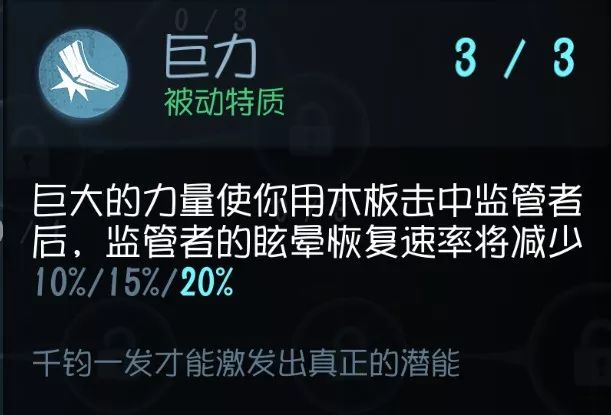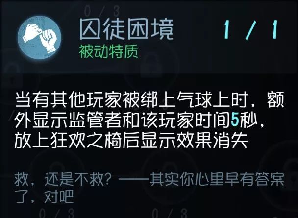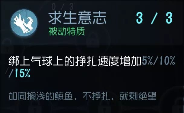 如果被抓时离椅子有一定距离的话,那么这个技能 会提高绑在气球时的挣脱的几率 。看似很美好的技能实质会遇上2个问题: 距离 凳子是否足够远 (不然+30%都没用); 挣脱之后能不能顺利摆脱BOSS。 个人认为,宁可被绑到气球去挣扎, 还不如努力不被绑上 ,遇到会玩的屠夫,除非有队友来施救,不然 靠自己的力量基本是逃不掉的 ,最多也就拖点时间罢了。 实用性:★★★ 泛用性:★★★★