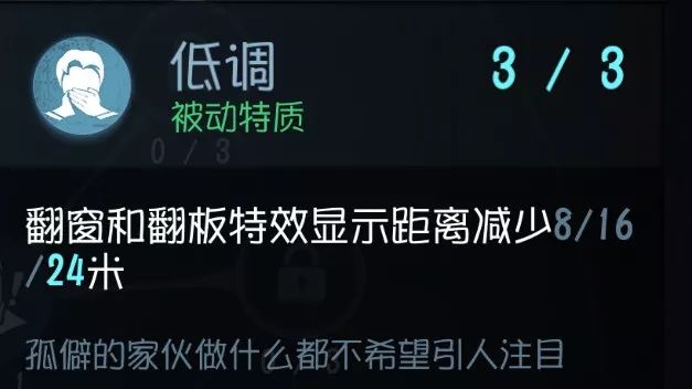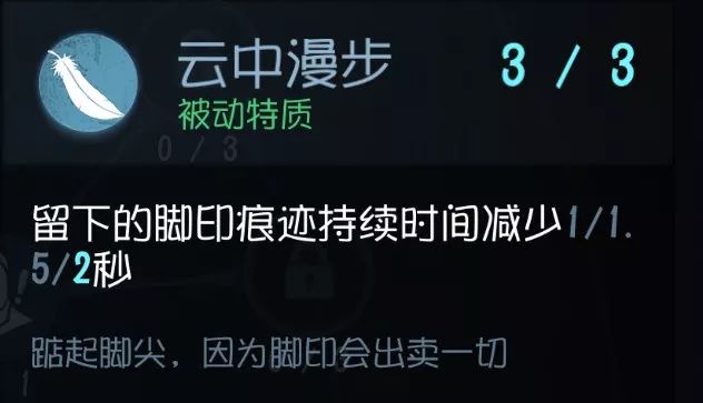 留下脚印持续减少。 大部分屠夫都会根据脚印去追人 ,所以减少脚印痕迹就显得尤为重要了。特别对于“魔术师”、“佣兵”、“空军”等拥有保命技能的角色来说, 使用技能之后防止被二次追踪是非常重要的 。除非你喜欢故意被屠夫发现,不然这个技能还是点一下。 实用性:★★★★★ 泛用性:★★★★★