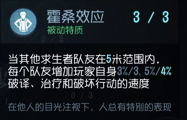 这个比“霍桑效应”强多了, 首先数值比“霍桑效应”翻了一倍,而且还能加给复数队友。 举个例子,2个队友陪你开电机的话,就有14%的加成,这就很可观了。现在很多队伍都喜欢开黑抱团解电机,如果大家都点这个解电机的速度就很恐怖了。所以想早日开门的话…… 实用性:★★★★ 泛用性:★★★★