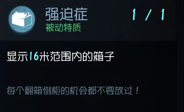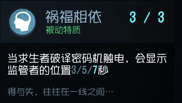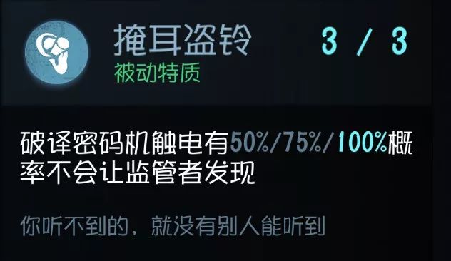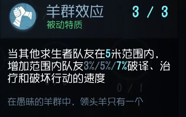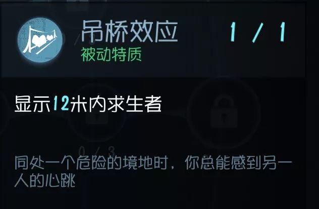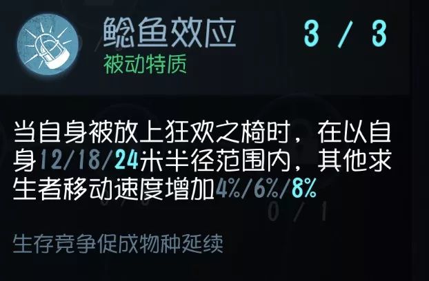 目前非常明显的技能,开门判断BOSS的位置然后进行逃生, 可惜只有5秒,遇到点了瞬移或者厂长这种本来就有瞬移的屠夫不一定能奏效 。 不过看得见总比看不见来得好 ,配合后面几个加速逃跑的技能还是很大机会能够跑出大门的。当然,前提是你们队伍能撑得到开完所有电机 实用性:★★ 泛用性:★★