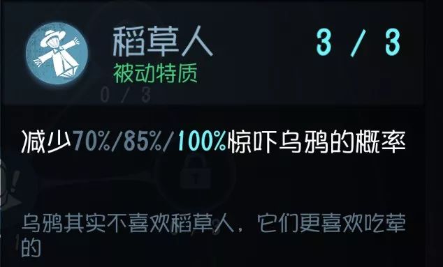 首先说一下这个乌鸦,是指走动时惊吓到的那些,而不是长时间不行动在头上盘旋的那些 ……因为屠夫刚好有一个技能“群鸦”是看乌鸦爆点的,作为求生者来说被追的时候也很少会顾及到路边的乌鸦。所以这个技能正好用来克制屠夫的“群鸦”技能(不知道其他玩屠夫的会不会点“群鸦”,反正我是必点的) 实用性:★★★★ 泛用性:★★★