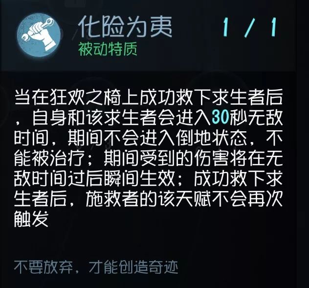 首先解释一下这个技能, 救人成功后,在凳子上被人救下来的人和救人那个都有30秒无敌,但如果途中被砍中,无敌后悔会倒地,而且每局只能用一次 。老实说这个技能对于守尸流屠夫来说简直就是噩梦……本人见过有4黑全部点这个技能的,3个队友一起来救,根本没辙……你说是追这个准备晕的人还是不追呢? 过于BT的技能,真心强烈建议把这个改成15秒就好了! 对于混野队的来说,这个技能的价值就没那么大了,不过为队友争取点逃跑时间还是可以的。 实用性:★★★★★(4黑的话★★★★★★★★★★) 泛用性:★★★★