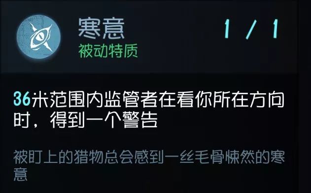 这个技能也是争议很大,但本人觉得寒意还是非常实用的,特别对于杰克这种跑得快还会隐身的屠夫, 预判后提前跑路对于自己的生命是最好的保证 (除非你可以打包票100%溜得过屠夫),等听到心跳的时候多数已经晚了。(缺点是容易被其他技能折叠到技能栏里面去) 实用性:★★★★ 泛用性:★★★★★