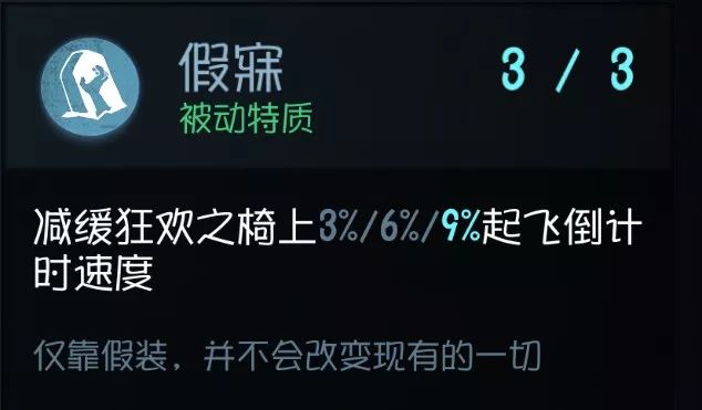 稻草人和云中漫步的前置。因为蹲行是不会被屠夫的“聆听”技能发现的,而且对于一些无法溜屠夫的角色来说, 利用障碍物使用蹲行的方式隐秘和转移效果可能更好 (反正真的跑起来你也跑不掉),加快蹲行速度对于许多角色来说还是不错的。 实用性:★★★ 泛用性:★★★★