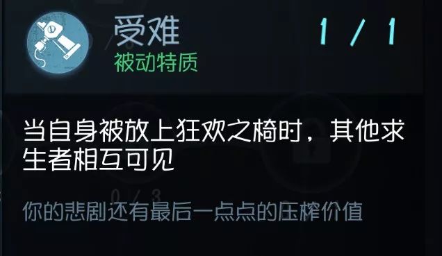 另外一个目前非常明显的技能,就是延长升天时间。现在的屠夫流行守尸流,此技能 和空军、佣兵等叠加的话能够 让守尸的屠夫守到怀疑人生, 给队友争取更多的时间解电机 。9%的数值中规中矩,如果你觉得经常被各种花式上椅,那么点这个技能就算被抓住的话,也算是死得其所了吧( ̄▽ ̄) 实用性:★★★★ 泛用性:★★