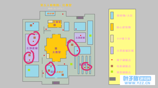 红教堂地图 v1.0简约版 在这里顺便说几点我对红教堂的理解吧~ •首先,这个图虽然障碍物繁多,但是结构并不很复杂,主要就是分成几个大区,比较整齐,好定位。我这里是为了蜘蛛,把右上部分额外做了一个长条,其实可以和旁边的部分算到一起的。这一个长条呢就特别适合蜘蛛砍了旁边电机的人之后结茧包在这里,很难救人。 •前院,视野太开阔,中后期在屠夫游走抓人时不建议来这边,容易被盯上。 •大教堂,这里面有很多排座位以及板窗,为了保持整洁度(其实也是懒。。可以一点一点描细线的)(°∀°)ノ我就没画,技术好的完全可以在大教堂里来回跑溜屠夫。当然萌新不建议尝试,如果地下室刷在这的话,失误了就凉凉。 •椅子。红教堂的椅子和电机有个显著特点,就是都挨着很近,有的一墙之隔在对面,有的直接就在一个小区域里。虽然军工厂和医院也有几个这样的结构,但绝对是没有红教堂多的。萌新修机时一定要注意。