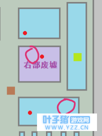 灵魂画手上线! 如图,电机离椅子很近的足有5个之多。 •遛人。个人觉得左上和右上的两团小废墟比较好溜。(我才不会告诉你是因为我玩屠夫经常在那被溜。。)这两个区域墙很高,路很窄。需要注意的是地图的中上方的墙边有一块大石头,转点时小心不要被卡住。右部废墟像迷宫一样,也有几个死胡同。大致标一下点就是: