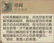 短暂施法 后,在 原地布置蛛网陷阱 ,路过的求生者会 被施加蛛网缠身的Debuff 。 分析 : 无敌点时代的终结技能 ,当求生者利用木板窗户和你绕圈的时候,在 木板窗户下面放一张蛛网 ,嘿嘿嘿。。。同时,当蜘蛛抓到求生者时,使用茧刑后 在附近使用结网 ,第五人格版“守株待兔”。 注意: 1. 经过蛛网 时,蜘蛛能获得 短暂的加速 (效果参考厂长转换傀儡位置)而求生者会被叠加Debuff,而且 蛛网没有存在时间限制 。合理布置蛛网、 缩小求生者活动空间 并踏入陷阱才是一个好的狩猎者,请自行多多练习布局。 2.在施放结网的同时如果 进行移动 那么 蛛网也会跟着延伸 ,适用于抓住求生者后“ 画地为牢 ”, 移动的同时蛛丝也会消耗,注意控制蛛丝量 。 3.在 密码机附近 使用结网,配合辅助特质 传送 会有意想不到的效果。
