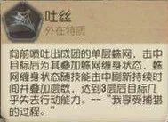 短暂施法 后,向 视野的正前方 喷出一团蛛丝。被命中的求生者会被施加蛛网缠身的Debuff( 减慢移动速度、增加翻窗、木板时间 ),叠加三次后将 接近失去行动能力 。 分析 :小短腿蜘蛛的远程技能,由于有 短暂的施法读秒时间 ,释放前观察 周围是否有建筑物、求生者是否直线前行中 ,从而提高命中率。 技能2 :喷网